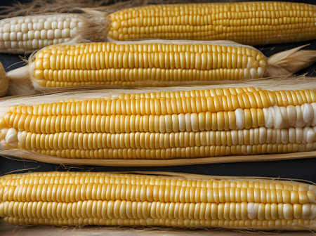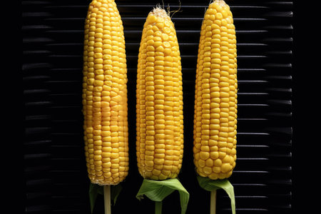 golden corn captured in meticulous photorealistic still life style on a black background. this stunning image is shot using ilford sfx and post-processed to create a unique and captivating visual. the photo highlights environmental awareness and utilizes the popular duckcore and cartelcore aesthetics. ai generated