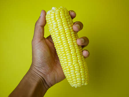 male hand holding corn for healthy food concept isolated on yellow background. vegetarian food
