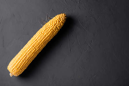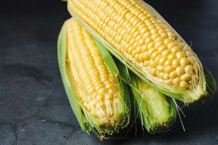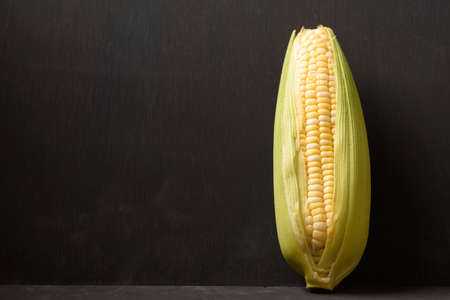 Raw sweet yellow corn on a dark table surface. Free space for text.