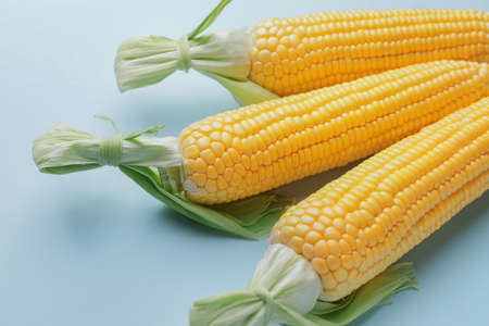 Fresh corn cobs on blue background