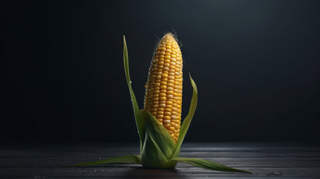 ear of corn showcased in a stunning still life photograph with intricate details and a dark vray tracing background. the bugcore and duckcore elements add a unique touch to the image, while the minimal retouching highlights the natural beauty of the corn. this photograph is perfect for advertising campaigns that promote environmental awareness. ai generated