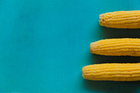 Colorful minimalistic still life of 3 ripe yellow cob of corn on a bright blue textured background. Vegan healthy food concept. Contrast food background with copy space.