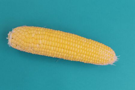 Corn cob on a blue background. Raw corn. Yellow cereal food. Harvesting cereals.