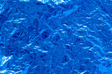 Crumpled, creased iridescent metal foil texture. Abstract colored blue background. Shiny monochrome surface.
