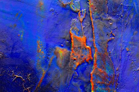 Close up detail of a acrylic painting with textures of dark blue, red and yellow