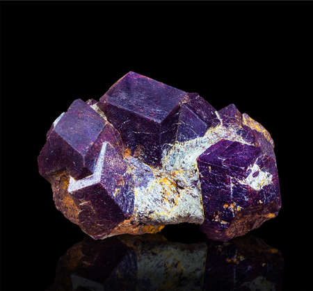 sample of raw khibinite with eudialyte mineral on black granite background close up from Khibiny, Kola Peninsula, Russia