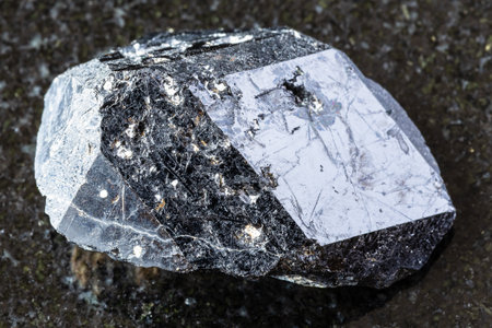 sample of rough molybdenite mineral on black granite background close up from Altai, Russia
