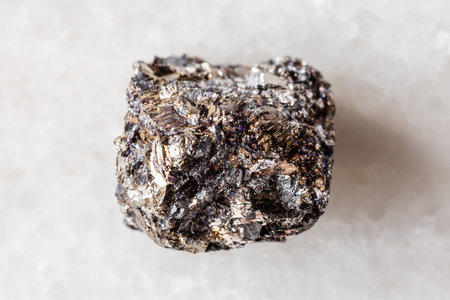 A single, unrefined specimen of a metallic mineral, showcasing its natural crystalline structure and brilliant, reflective luster. Isolated on a clean white background, this image highlights the raw beauty and industrial potential of geological resources, perfect for scientific, educational, or metallurgical themes.