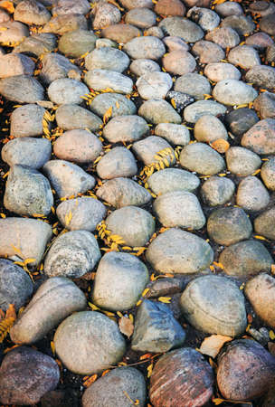 Huge large stones and pebbles with yellow fall autumn leaves on the ground, background, wallpaper, closeup