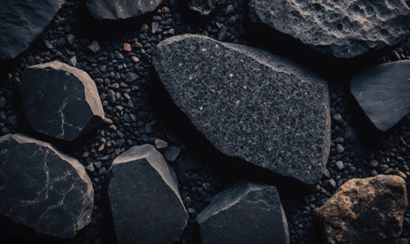A close-up of a textured rocky ground with different sizes and shapes of stones, under a bright natural light