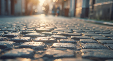 AI Generated. Warm sunlight illuminates cobblestone street creating a charming and rustic urban setting