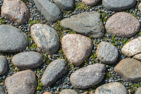 A fragment of a road covered with large cobblestones of various shapes, top view