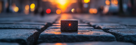 Solitary Object Emits Warm Glow On Cobblestone Street At Sunset, Evoking Themes Of Memory And Loss