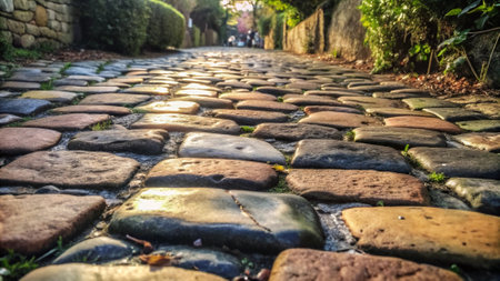 A picturesque stone pathway made of cobblestones and bricks, a testament to architectural heritage, creating a textured background for urban scenes