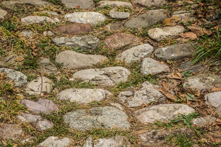 rocky vintage road with different shapes and textures between which sprouts of grass grow