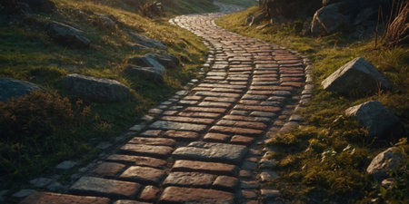 AI Generated. Fantasy medieval brick path Stone road winding into the horizon