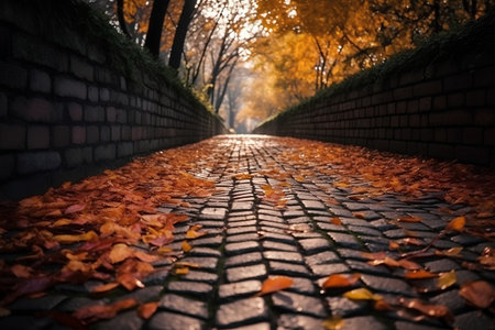 Autumn alley with fallen leaves and brick pavement. Selective focus.
