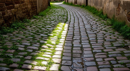 A captivating view of a cobblestone pathway, featuring detailed stones and vibrant greenery, creating a serene urban setting with soft natural light accentuating the scene.