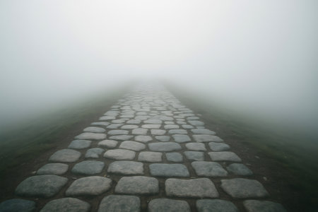 Cobblestone path disappearing into the fog, creating a mysterious and evocative atmosphere that invites exploration and reflection