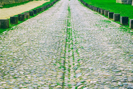 old grunge cobble stone abandoned road with growed plants from below narrow focus path way object
