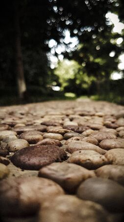 Vintage color style and vignetted effect. Selective focus on a part of antique stone road and some of little glass.