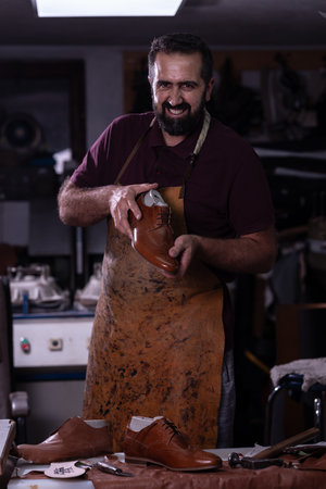 Moustached footwear artisan making luxury handmade male shoes in small footwear workshop studio. Small bisuness and handicraft, footwear manufacturing Concept