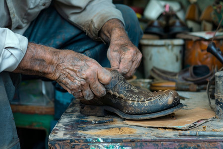 An elderly shoemaker at work close-up