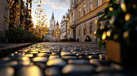 AI Generated. Warm sunlight illuminates cobblestone street creating a charming and rustic urban setting