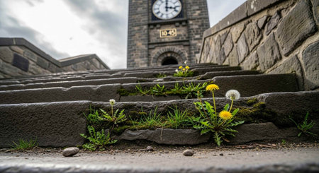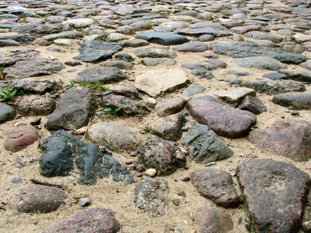 rocky vintage road with different shapes and textures between which sprouts of grass grow