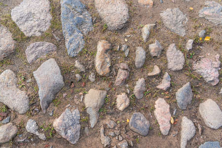 A top view of a fragment of an old road, pitted with stones of various colors and sizes. The gaps between the cobblestones are filled with soil. Background. Texture.