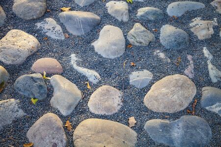 The view of pattern of the road paved with rounded big cobblestones. Stone background. Japan