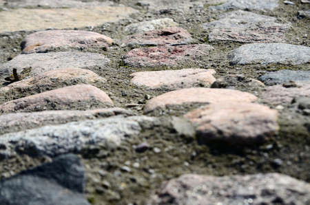Cobblestones background. Paved road. Cobblestone surface. Selective focus.