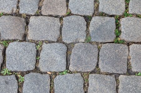 Stone pavement texture. Granite cobblestoned pavement background. Cobbled stone road regular shapes, abstract background of old cobblestone pavement close-up. Parallelepiped.