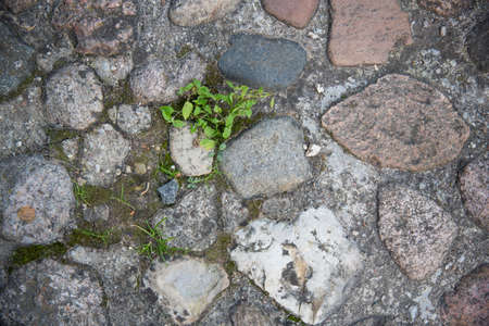 rocky vintage road with different shapes and textures between which sprouts of grass grow