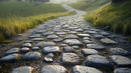 Sunlight casts gentle shadows on a rustic cobblestone path, creating a serene atmosphere in the outdoors.