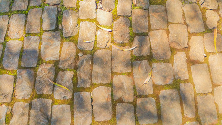 Old cobblestone path illuminated by low sunlight with moss growing between the stones