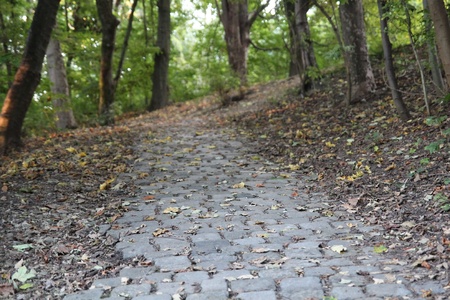 old grunge cobble stone abandoned road with growed plants from below narrow focus path way object