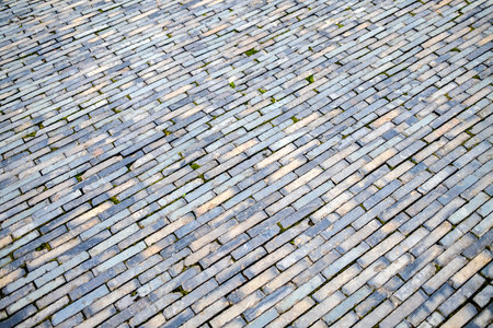 An old stoneblock pavement cobbled with rectangular granite blocks with crushed rock fines between blocks. Photo in perspective with selective focus
