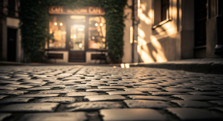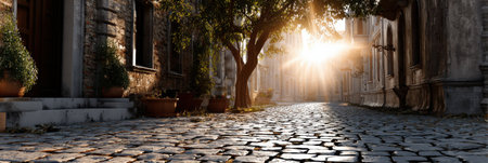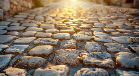 AI Generated. Warm sunlight illuminates cobblestone street creating a charming and rustic urban setting