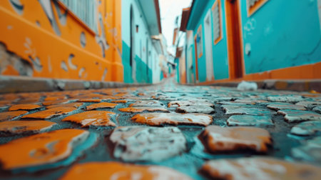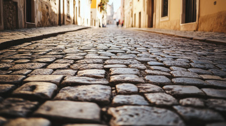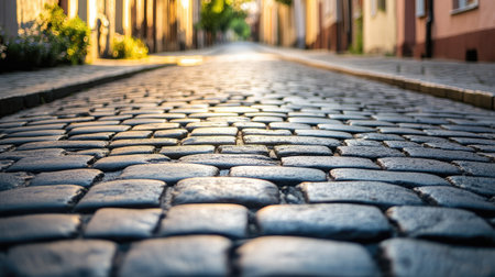 A captivating view of a cobblestone street captured from a low angle, showcasing colorful buildings and soft morning light. Perfect for travel and urban themes.