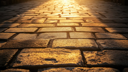A close-up view of a striking brick block floor illuminated by warm sunlight, showcasing intricate textures and patterns, perfect for urban or architectural themes.