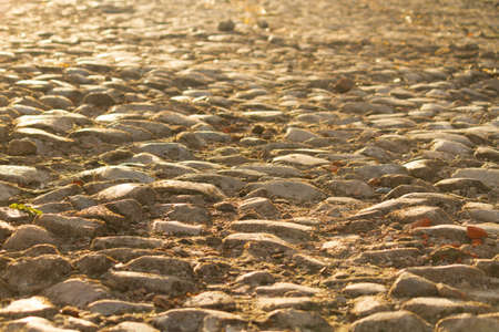 selective focused Cobblestone pavement.Vintage stone street road pavement texture.pattern of stone block paving.Granite cobble stoned pavement background. old cobblestone pavement
