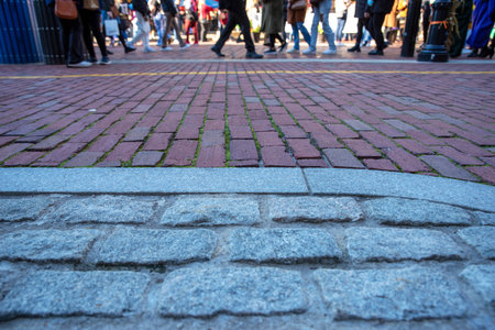 Cobblestone and brick street on Freedom Trail Boston with pedestrians