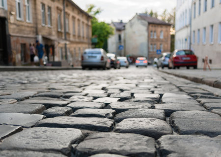 Picture of the cobblestone paved road closeup against the blurred background of the buildings and car parking. Stone pattern on the paved road.