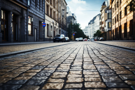 Cobblestone street. This image showcases a detailed view of a cobblestone street. The focus is sharp on the foreground, with a blurred background.