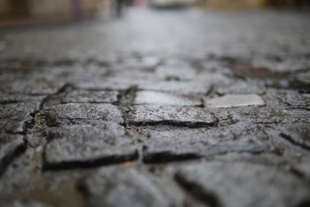 Close-up of glistening paving stones on an ancient street in the evening. Background is out of focus