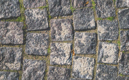 rocky vintage road with different shapes and textures between which sprouts of grass grow
