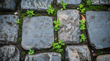 Stone pavement with green shoots sprouting in the joints, illustrating nature's quiet persistence in urban spaces