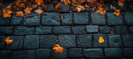 Autumn Leaves on Cobblestone Street, Textured Background with Fallen Leaves, Seasonal Fall Image