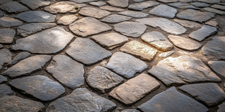 Antique cobblestone street background with worn-out irregular stones, medieval and rustic feel.